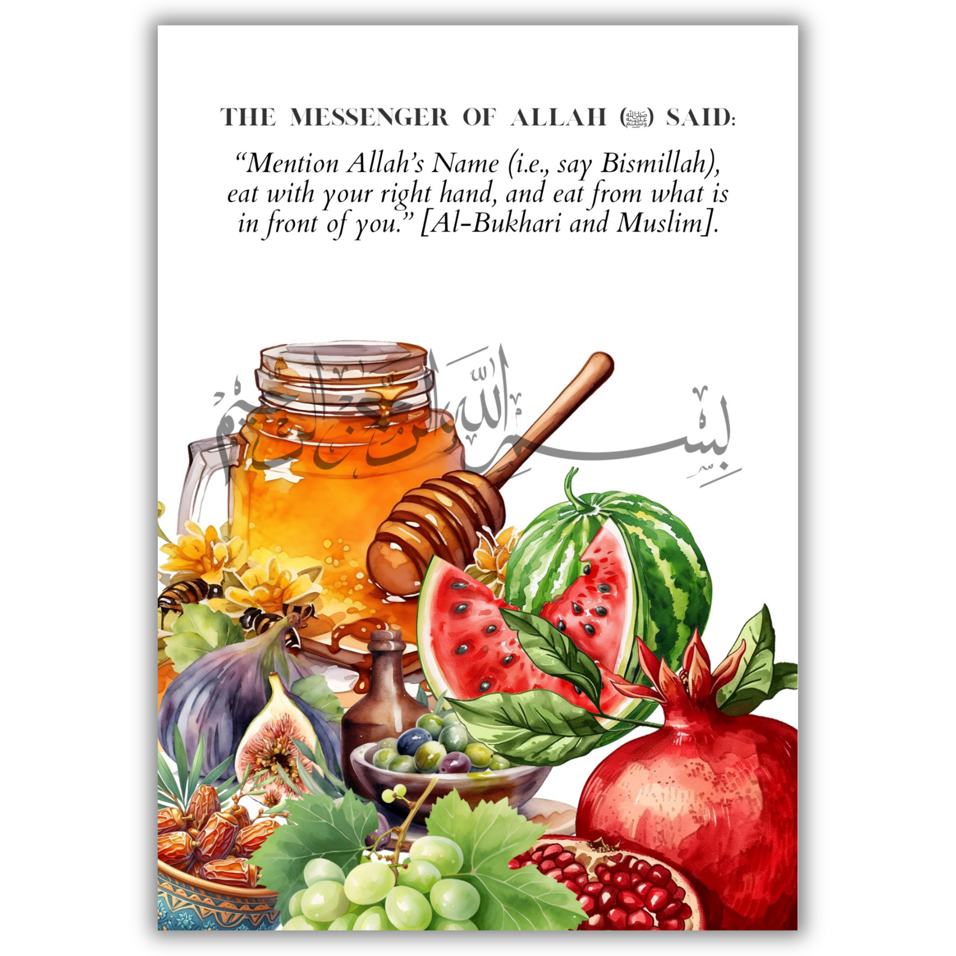 Dieses Küchenposter mit der Basmala, den Sunnah Lebensmitteln im Islam und dem Hadith von unserem geliebten Propheten saw über den Adab beim Essen ist perfekt geeignet als Dekoration für Dein Eigenheim oder auch als Geschenk für Deine Liebsten.