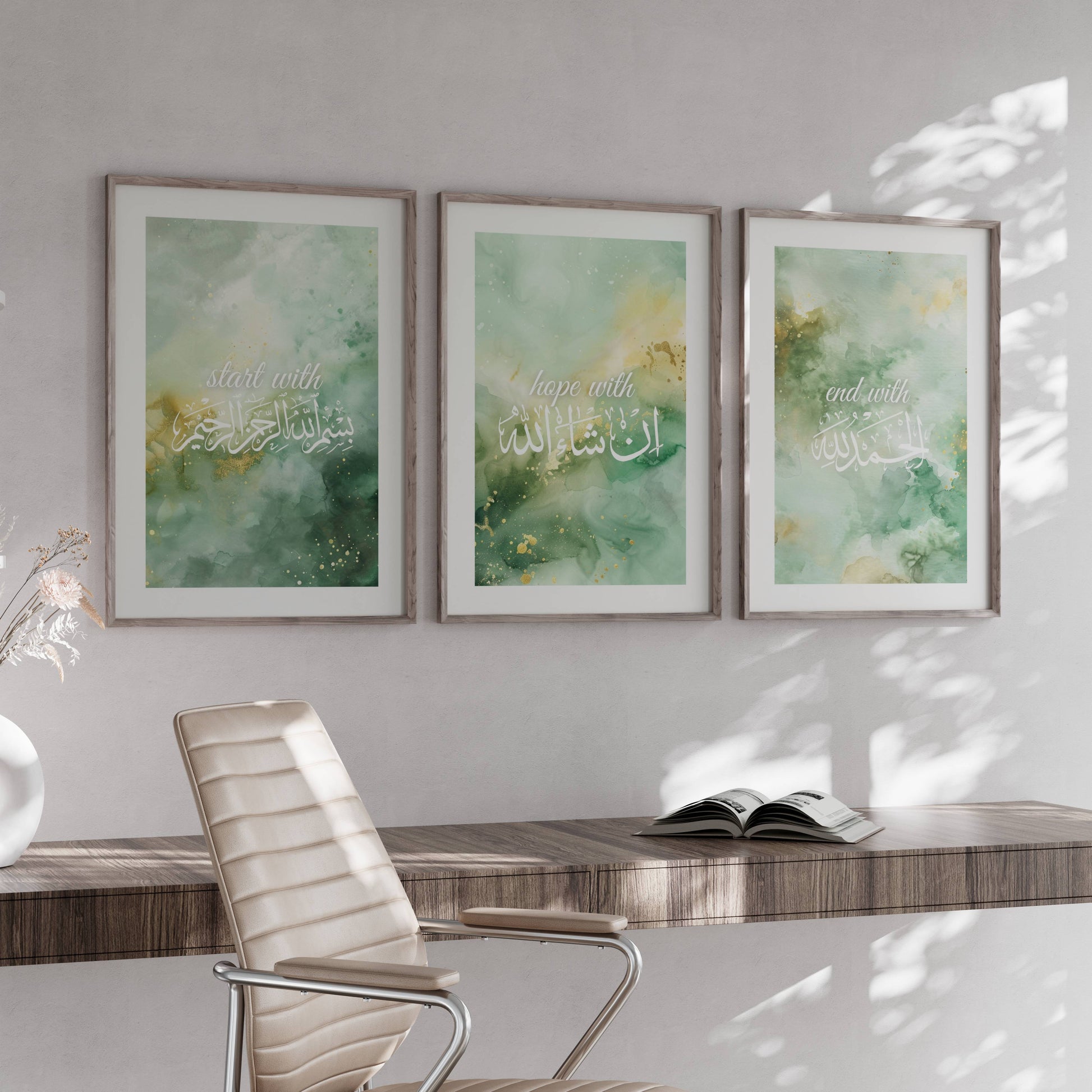 Ein grünes Posterset mit den berühmten Zitaten start with Bismillah, hope with InshaAllah und end with Alhamdulillah - es ist perfekt geeignet, um kahle Wände zu schmücken und mit islamischem Stil zu bedecken.