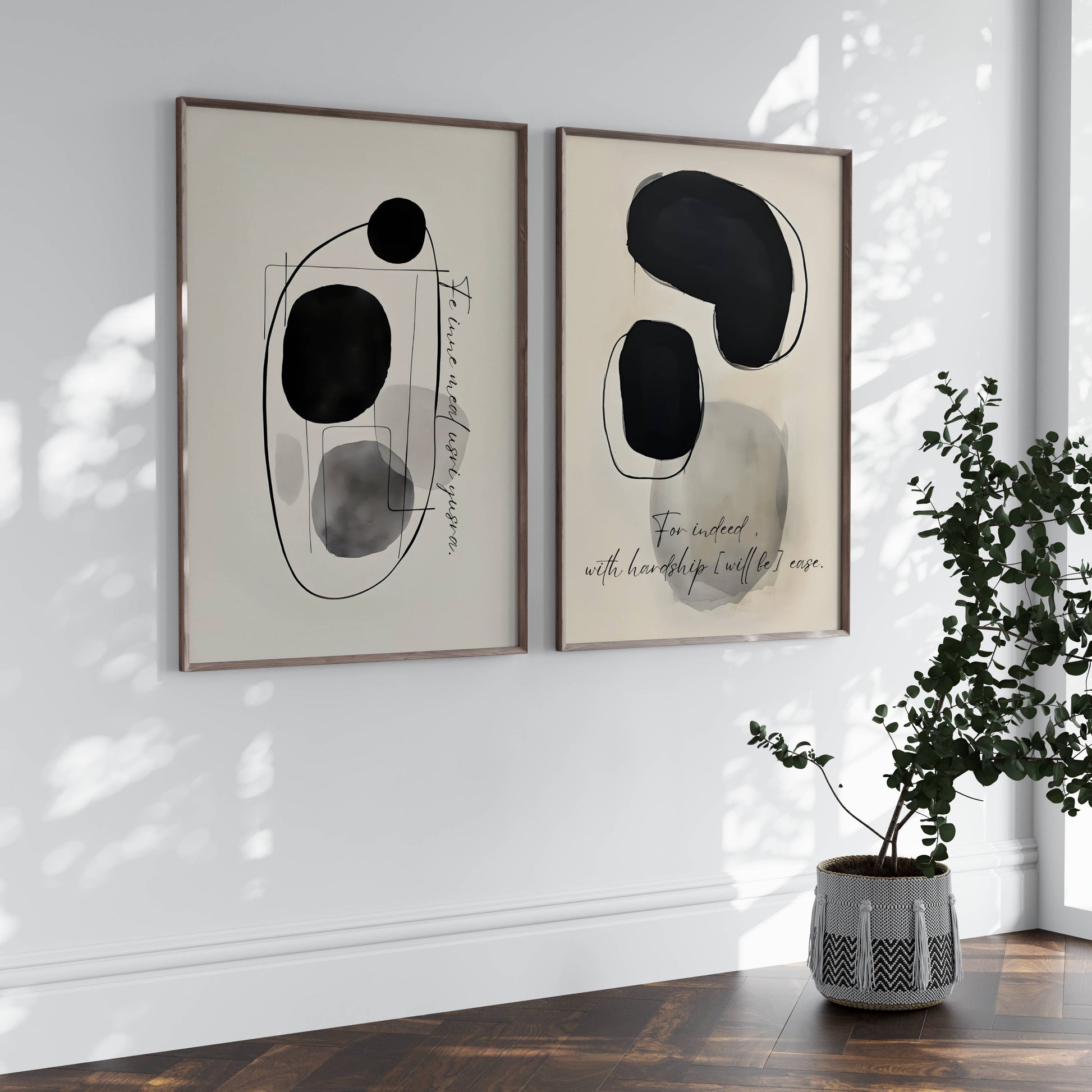 Ein ästhetisches Posterset mit dem Vers fe inne meal usri yusra - For indeed, with hardship will be ease als Ergänzung für das Eigenheim oder auch als Geschenk für die Liebsten.