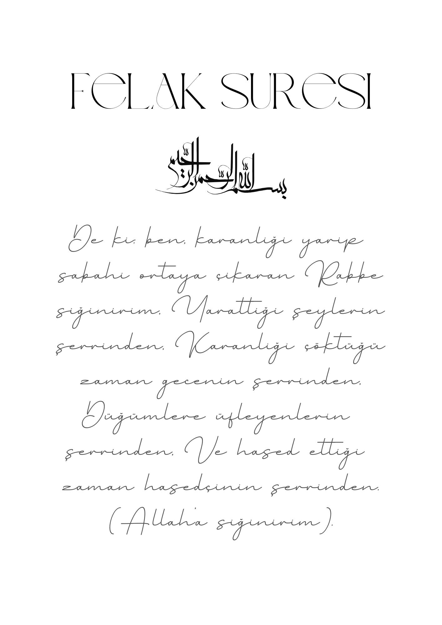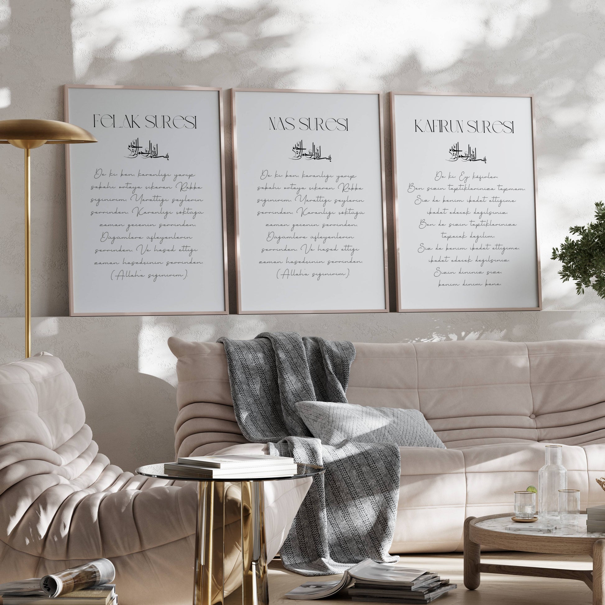 Ein schlichtes Posterset mit den Suren Falak, Nas und Kafirun auf Türkisch - das perfekte Trio, um kahle Wände zu schmücken und dem Eigenheim islamische Werte zu verpassen.
