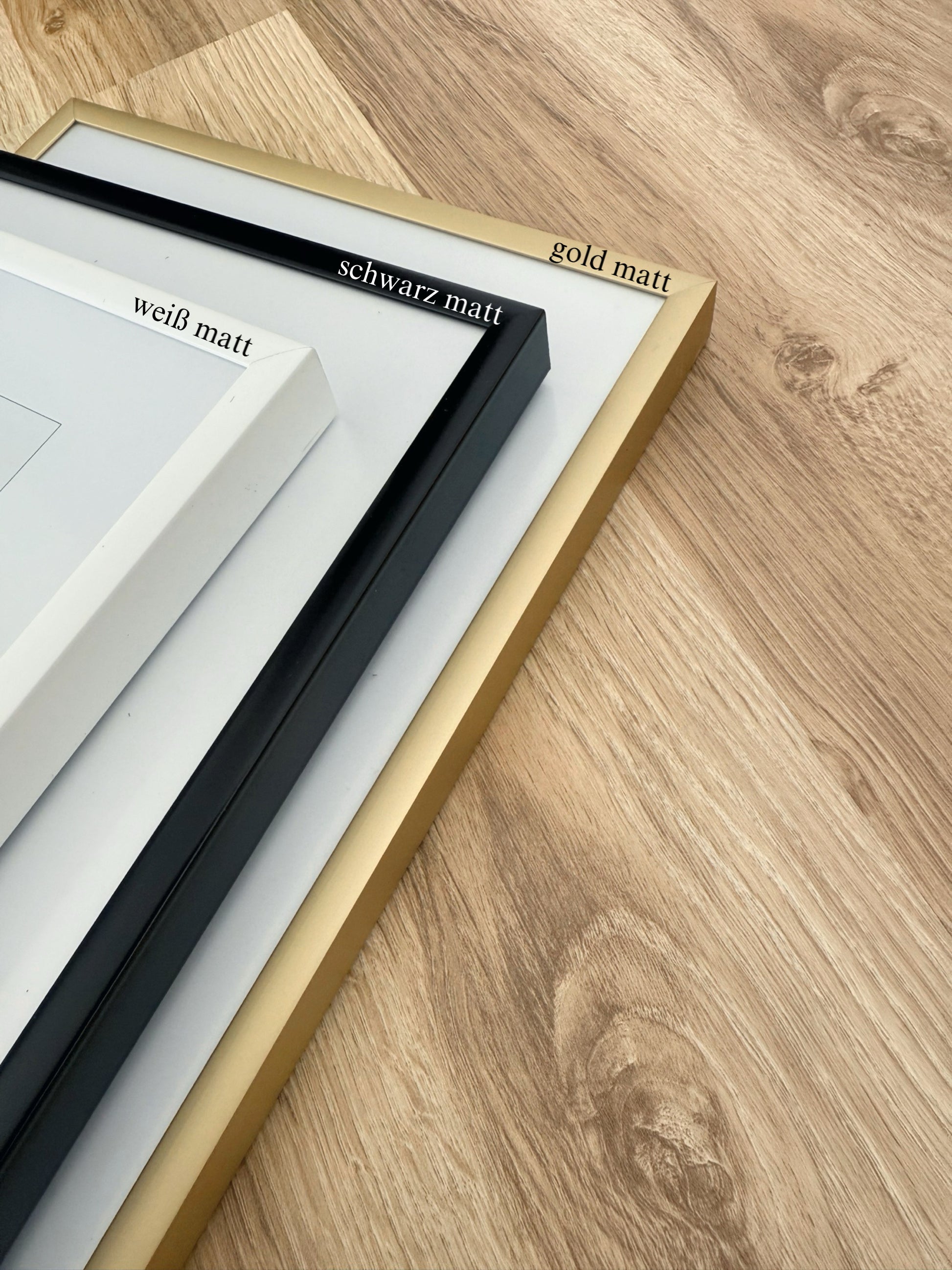 Das Poster kann mit oder ohne Rahmen geliefert werden (gilt nur für DIN A4 und DIN A3).Die Bilderrahmen sind aus hochwertigem Aluminium und können in den Farben schwarz matt, weiß matt oder gold matt erworben werden.