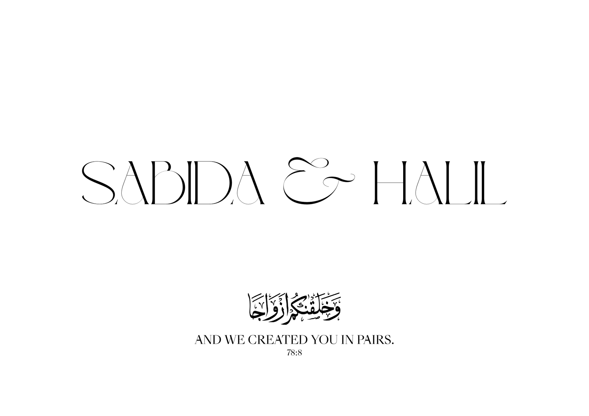 Personalisierte Poster sehen immer gut aus, da sie einzigartig sind und die Namen von sich zwei liebenden Menschen tragen. Der Satz 'And We created you in pairs' ergänzt das islamische Poster perfekt und zeigt, dass Gott den richtigen Zweien immer Liebe schenkt, damit sie glücklich werden.