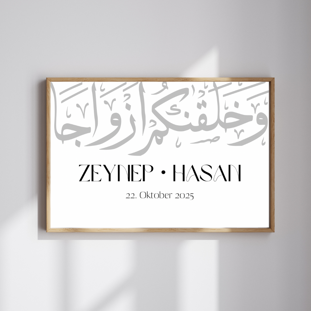 Personalisierte Poster sehen immer gut aus, da sie einzigartig sind und die Namen von sich zwei liebenden Menschen tragen. Der Satz 'And We created you in pairs' ergänzt das islamische Poster perfekt und zeigt, dass Gott den richtigen Zweien immer Liebe schenkt, damit sie glücklich werden.
