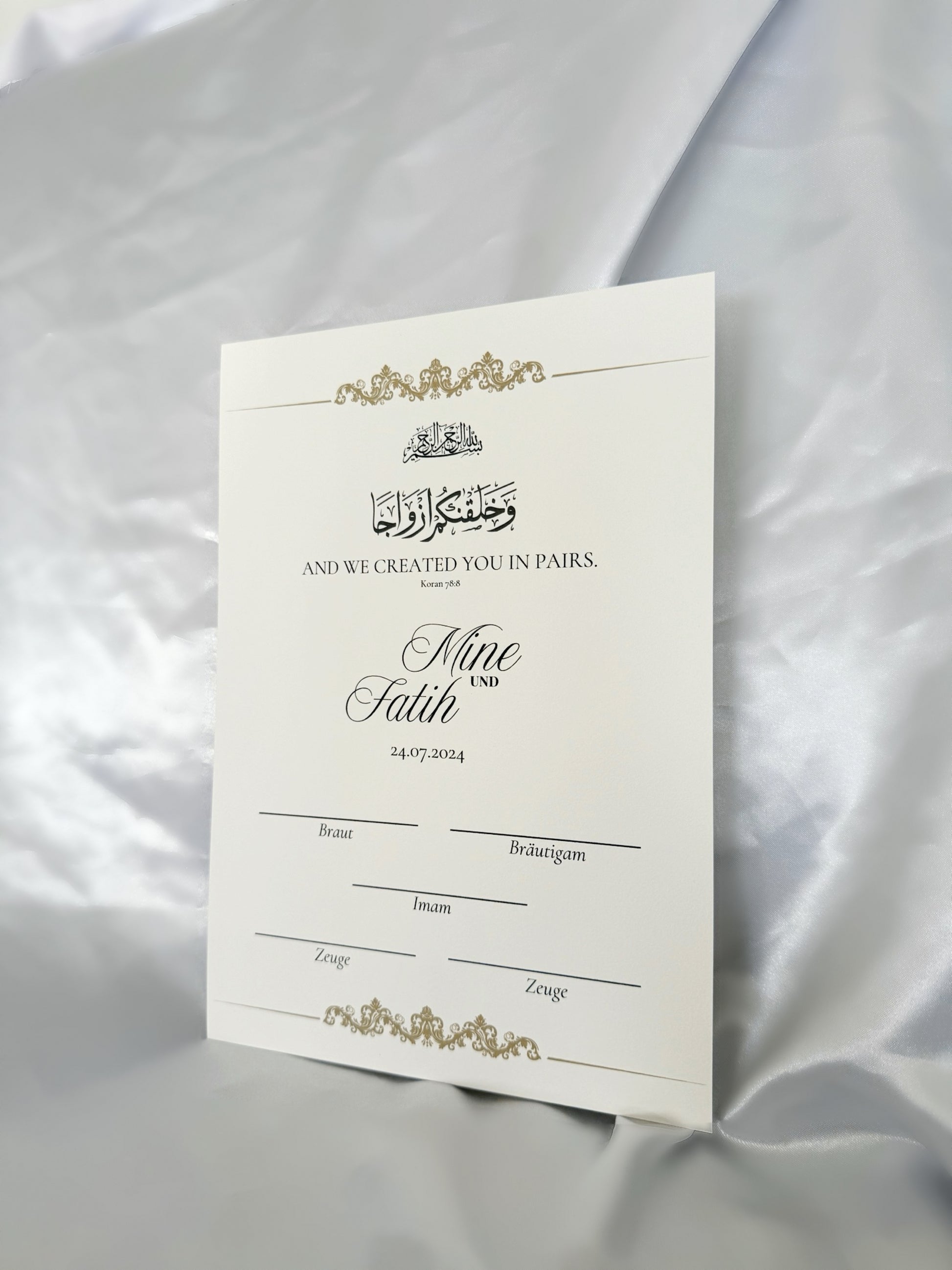 Diese einzigartige islamische Eheurkunde auf Aquarellpapier darf in keiner Nikah-Zeremonie fehlen. Es ist sehr besonders und der Nachweis für einen sehr unvergesslichen Moment.