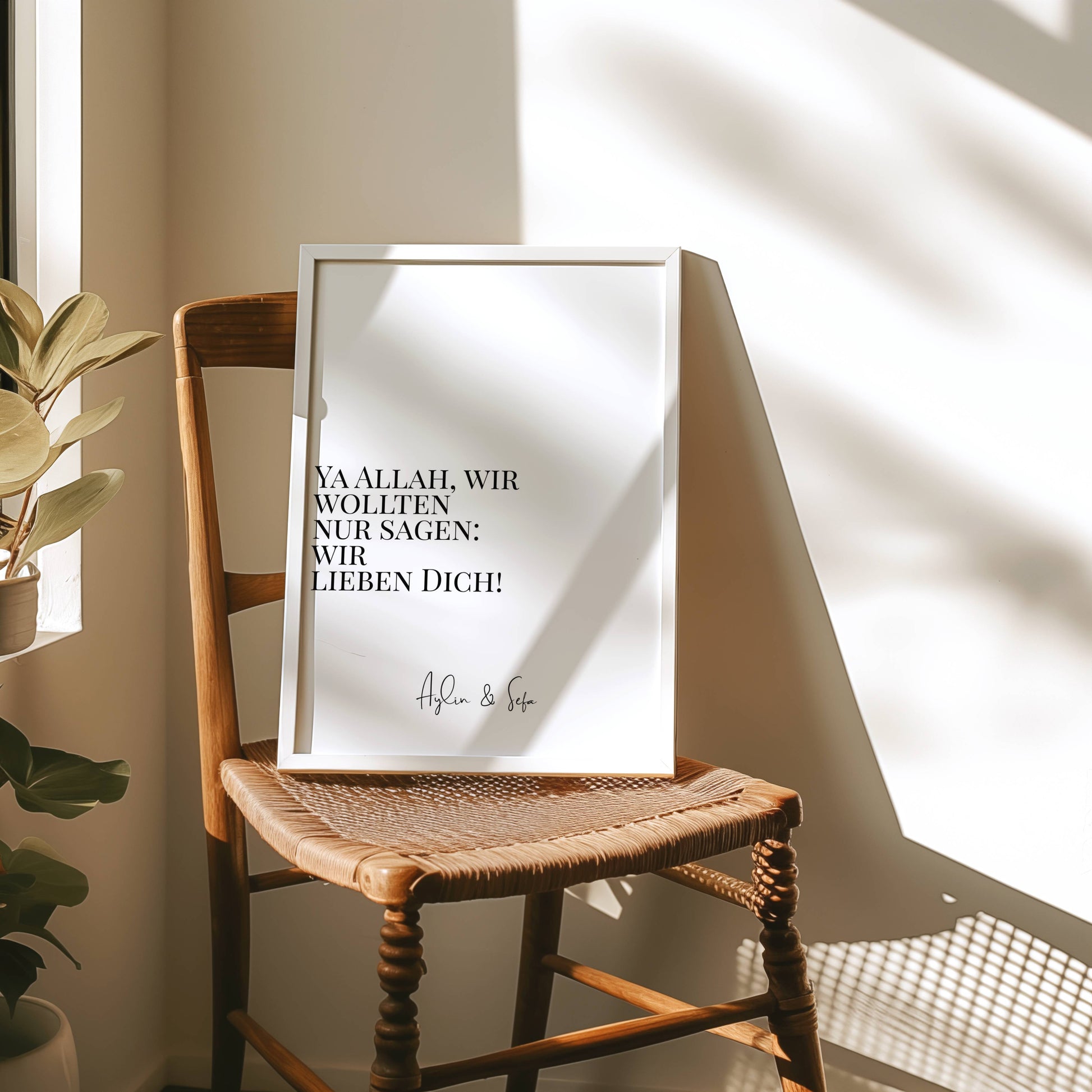 Du wurdest von Deinen Liebsten zur standesamtlichen Trauung eingeladen und benötigst ein bedeutungsvolles Geschenk? Dieses islamische Poster mit Personalisierung ist perfekt dafür geeignet und wird immer ein Eye-Catcher bleiben.